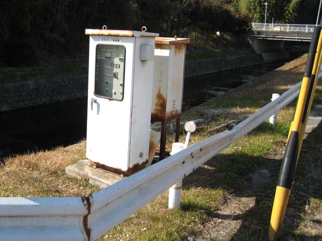 香久山から天白側へと流れていく「小川」にかかっている小川橋の横です。 パネルには、汚水ポンプ制御板とあります。 ここから、浄化した汚水でも流しているのでそうか?