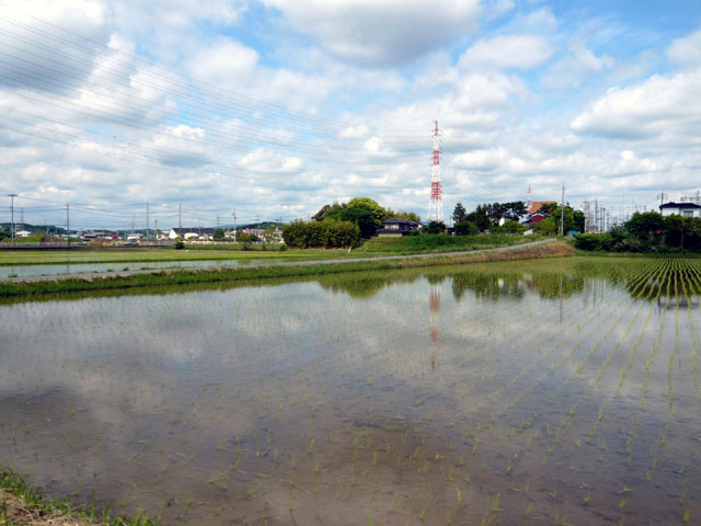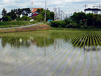 野方町の田んぼの景色です。 整然と並ぶ稲が、とても美しいです。 じきに、緑のじゅうたんが出来ますね。