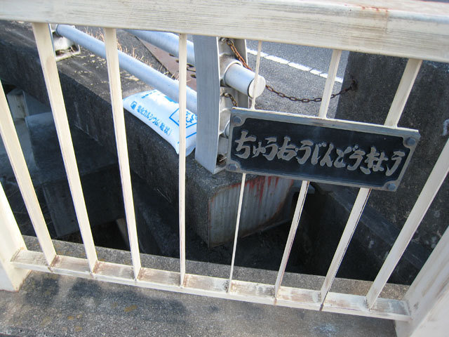 ここは、中央橋です。 何気なく置いてある袋の横には「塩化カルシウム」と書いてありました。 融雪や凍結防止として使うために置いてあるんですね。