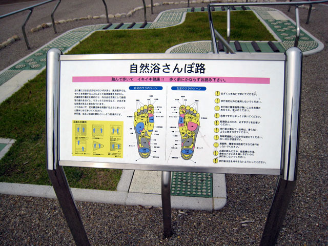 日進市浅田町西田面の上納池スポーツ公園。 健康広場内に自然浴さんぽ路として、足つぼを刺激するコーナーがあります。 けっこう、効きます。