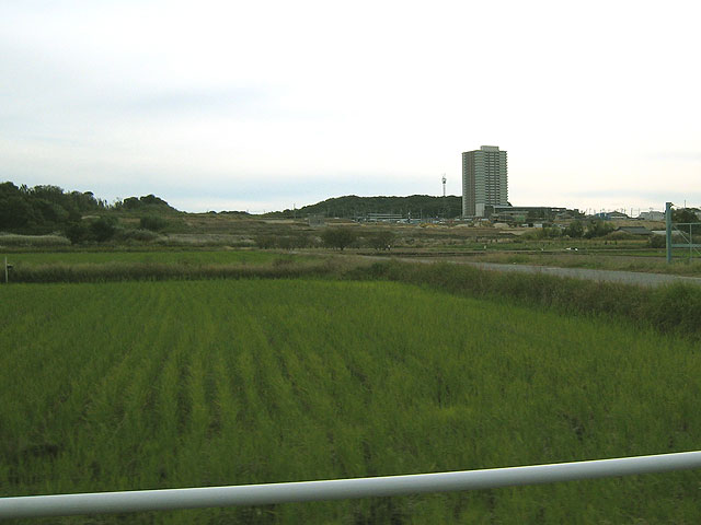 山を背景に、田んぼの真ん中にそびえたつ建物