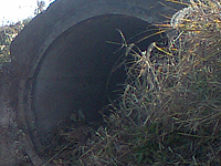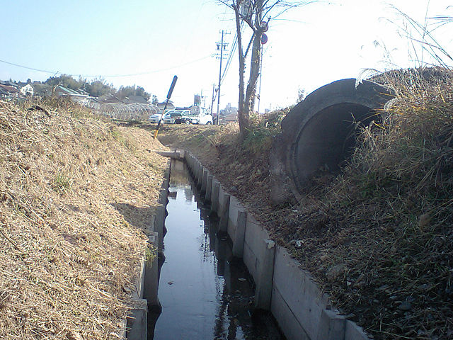 日進市折戸町鎌ヶ寿にある、使われていな土管です。 大人がしゃがんで通れる大きさの土管です。 土管の上には道路、左の土手は田んぼ。 すぐそこに折戸病院が見えます。