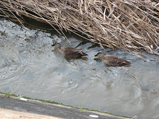 毎年、春近いこの季節になると、カモが優雅に水面を泳ぐ姿を目にします。 仲良く並んで、泳いでいます。 ここは、日進市赤池の繁盛川です。