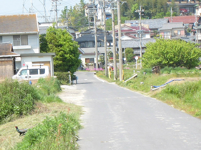 ここは、藤島町八反田です。 田んぼから田んぼへキジが道路を横断です。 他にも、サギやツバメが飛んでいて田舎の風景ですね。