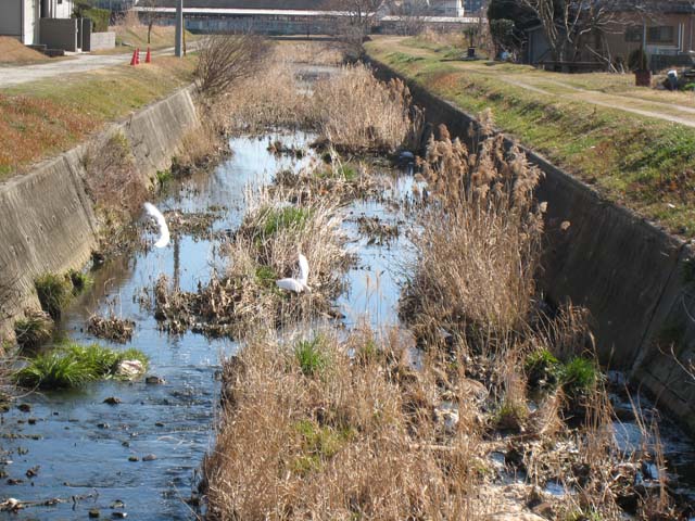 小川橋の南側、天白側へ流れていきます。 サギのつがいが飛んでいきました。 もう直ぐ春 繁殖・産卵の季節のようです。 でも、川が汚いのがちょっとねぇ・・・残念。