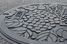 下水道のマンホールは、色々なデザインがあります。 日進市の下水道マンホールは、日進市の花「あじさい」がデザインされています。 ここは、日進市梅森町です。