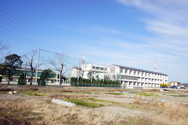 田んぼの向こうに見えるのは、日進市立西中学校です。