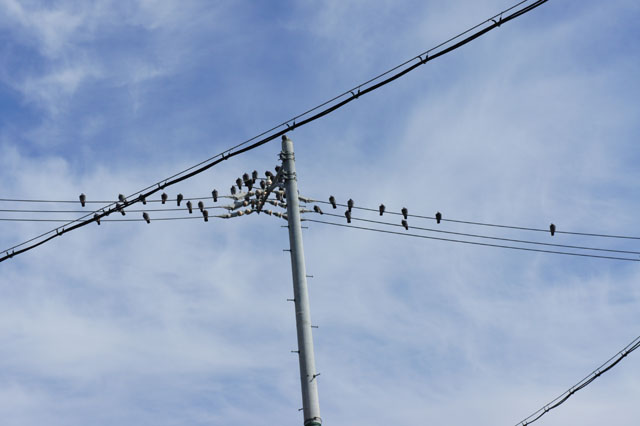 白山の交差点から西へ500m、岩崎川の近くの電柱に鳥たちが肩を寄せて止まっています。