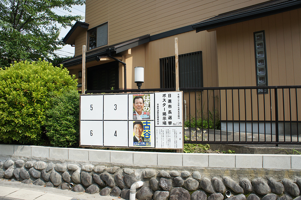 日進市の町中に赤と青の看板で応援合戦が繰り広げられています。