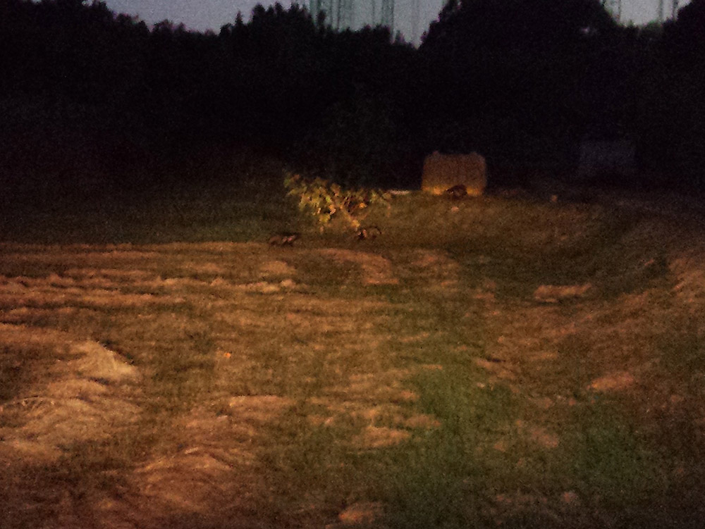 たぬきの親子が森の中へ逃げていきます。