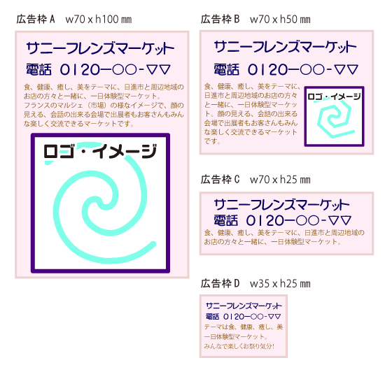 | 広告枠A → w70 x h100 ㎜ ・・・18,000 円 | イメージ広告、デザイン自由です。 |