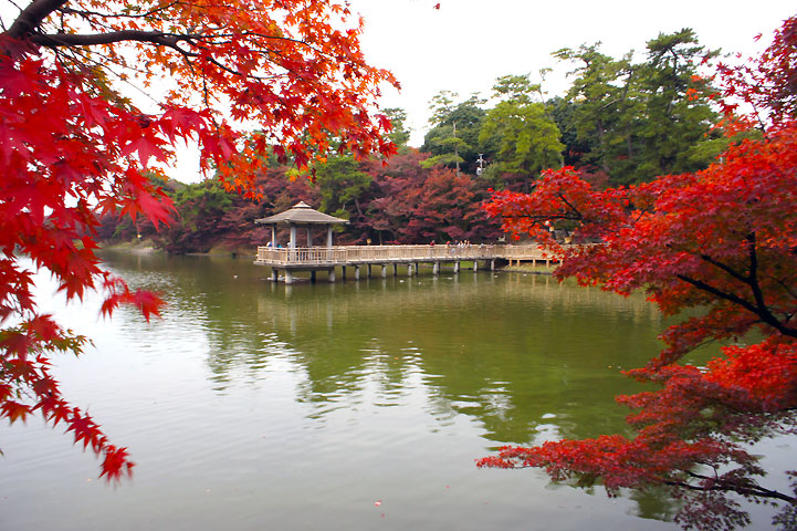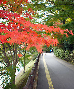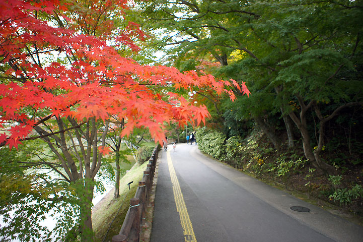 遊歩道沿いにあるくと、池と紅葉のコントラストが