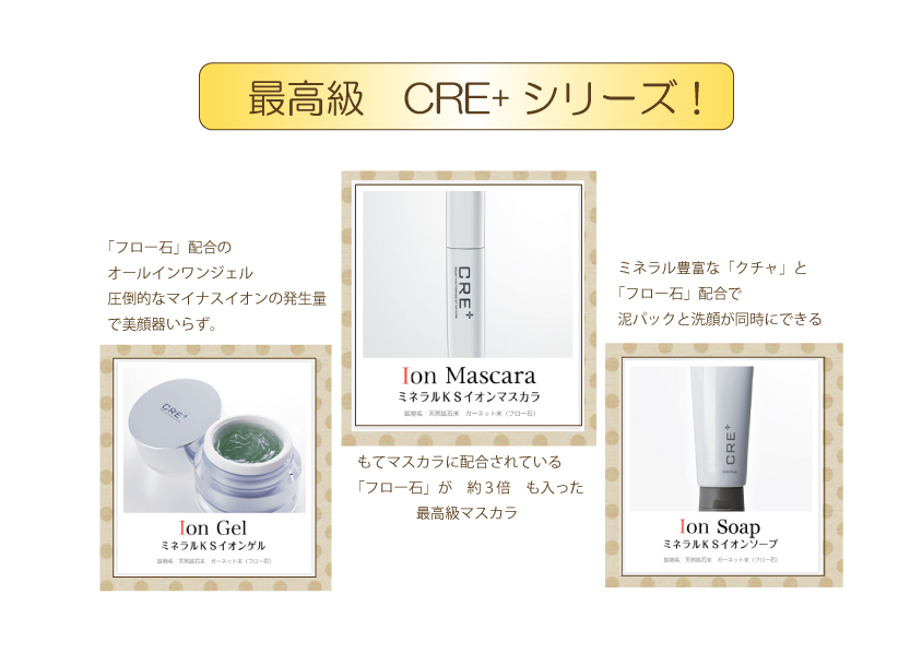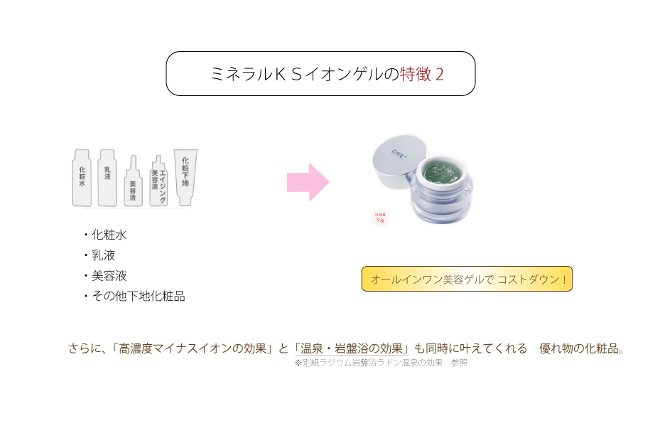 ミネラルKSイオンゲルcre+ (化粧水、乳液、美容液、下地、UV,美顔器)の
